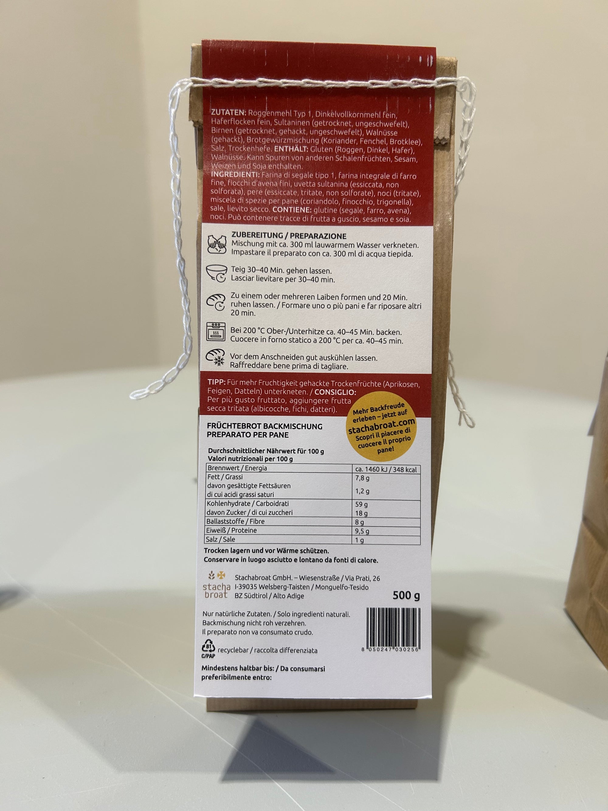 Aromatisches Roggen- und Dinkelmehl, Haferflocken, Sultaninen, Birnen und Walnüsse vereinen sich zu einem saftig-würzigen Früchtebrot – ganz ohne Zusatzstoffe, mit natürlicher Süße und typischem Südtiroler Charakter.